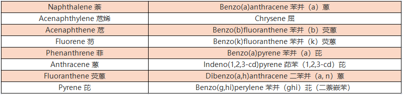 PAHs(PolycyclicAromaticHydrocarbons,多环芳香烃),是由二个至七个不等的苯环所组成的线状、角状或一团状的化学结构物。主要是由于含碳化合物不完全燃烧或在石化燃料的使用过程中产生的。目前已知的PAHs超过100种以上,而被美国环保署列明受管制的PAHs则有16种(如下):
